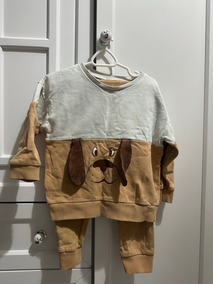 Kahverengi ve gri tonlarda, uzun kollu, yuvarlak yakalı, yumuşak ve sıcak kumaştan, baskılı köpek yüzü ve kürk detaylı bebek erkek takımı. 24-36 ay