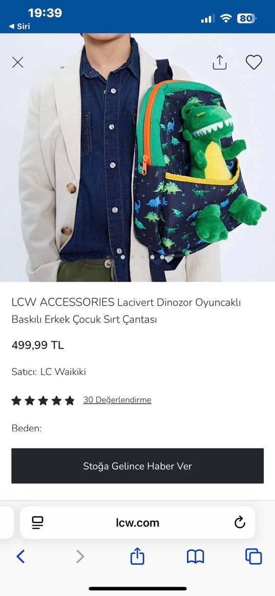 Sentetik kumaştan, baskılı ve oyuncak dinozor detaylı erkek çocuk sırt çantası. Cırt cırtlı kapanışı vardır, canlı açık renkler kullanılmıştır. Cok az kullndı sıfırdan farksız