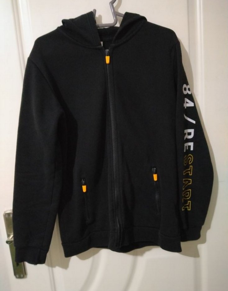 12/13 yaş sadece kol uçlarında deforme var. Siyah, kapüşonlu ve fermuarlı erkek çocuk sweatshirtü. Uzun kollu, baskılı '84/RESTADT' yazısı kollarda. Yumuşak ve sıcak kumaştan, fermuarlı ceplerle.