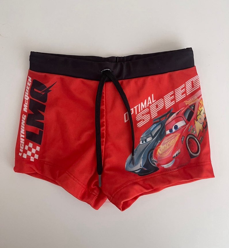 Kırmızı renkli, baskılı yarış arabası desenli, ayarlanabilir ipli siyah bel bantlı erkek çocuk mayo şortu. 3-4 yaş