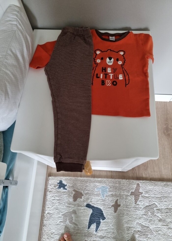 Lcw marka, altı kahverengi çizgili üstü turuncu ayıcıklı yumusak kumaslı. Üstü yıkama hatasından dolayı çekti ve fazla giydiremedim o yuzden.