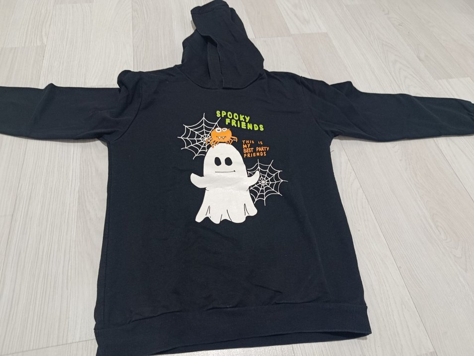 Siyah renkli, uzun kollu ve kapüşonlu bu sweatshirt, yumuşak ve sıcak kumaştan üretilmiştir. Üzerinde hayalet, örümcek ağı ve 'Spooky Friends' yazılı baskı bulunmaktadır. Rahat ve parti tarzına uygundur. Bir iki kez giyilmiş defosuz yeni alınmış gibi sweatshirt 9/10 yaş #lcw#defacto