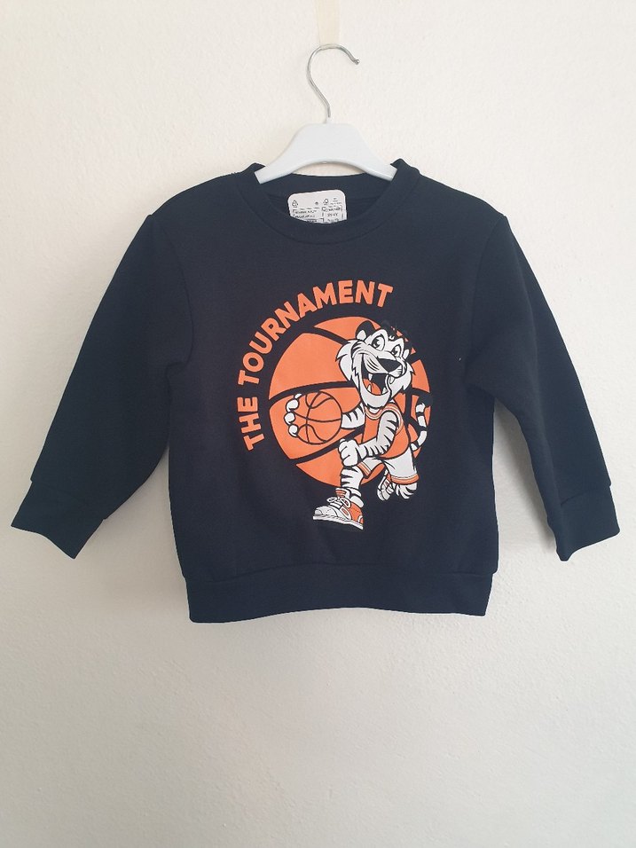 Erkek çocuklar için yuvarlak yaka, uzun kollu, bol kesim sweatshirt. Yumuşak tüylü kumaştan, renkli baskılı ve örme dokulu. Rahat sokak stili için ideal.