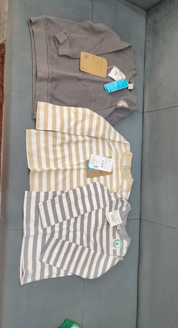 Çocuklar için düz gri baskılı ve bej ile gri tonlarda çizgili uzun kollu içlikler. Rahat kullanım sağlar.ilk gri 2+3 yaş ama oversize geniş güzel. son 2 tişört 3-4 yaş.