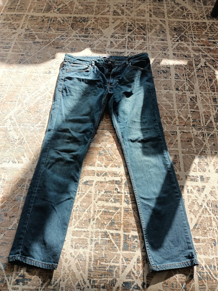 Gri-mavi tonlarında, tokalı, normal boy, regular fit erkek kot pantolon. Günlük ve sokak stiline uygun.34/31