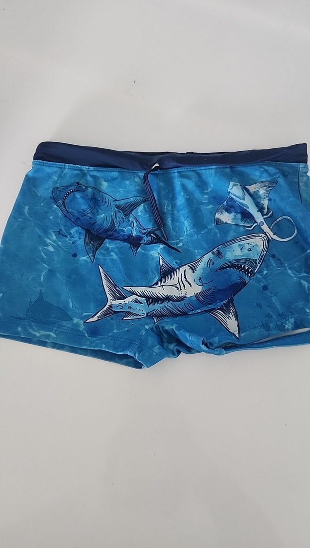 Renkli baskılı köpekbalığı ve vatoz desenli mavi erkek çocuk mayo. Ayarlanabilir bağcıklı bel detayına sahiptir.