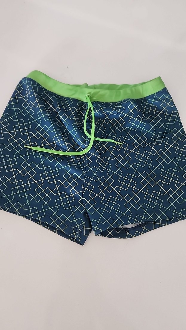 Yeşil bel ve bağcık detaylı, geometrik desenli mavi erkek mayo şortu. Rahat ve renkli tasarım .