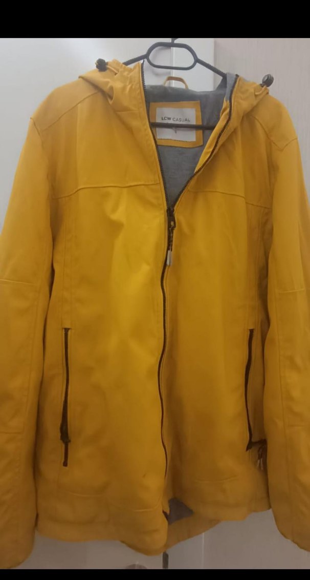 Sarı parlak deri malzemeden, fermuarlı ve uzun kollu, bol kesim midi uzunluğunda erkek ceket. Günlük rahat sokak stili için uygundur.