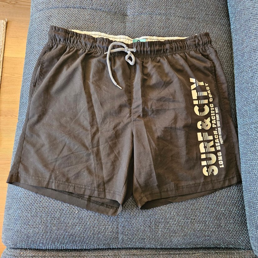 siyah, bol kesim erkek şort, belde ayarlanabilir bant ve yan tarafında baskı detayına sahip. Plaj için uygun. bel esnetmeden 45 boy 45