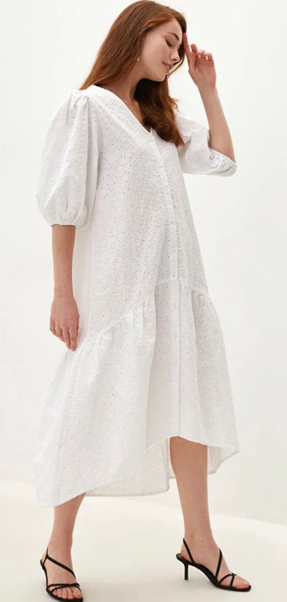 Beyaz nakış detaylı, V yakalı ve kısa balon kollu uzun elbise. Nefes alabilen keten kumaştan, salaş kesimli ve fırfır detaylıdır.