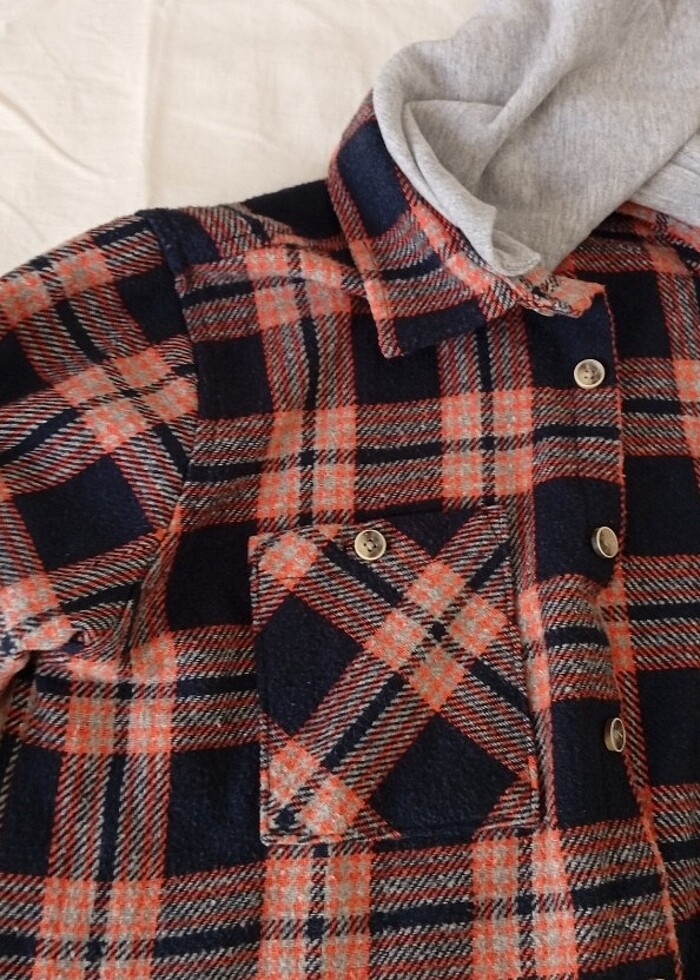 Oduncu gömlek, sayılı giyildi, kapşonu çıkarılıp takılabilir düğmeli, tertemiz