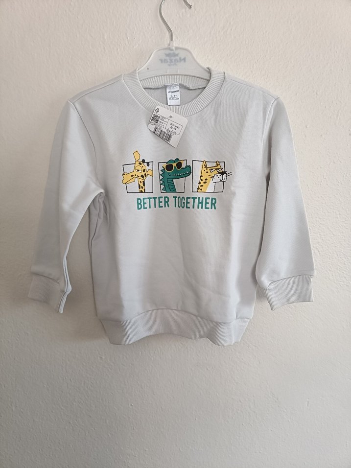 Gri renkli, uzun kollu, yuvarlak yaka ve bol kesim erkek çocuk sweatshirtü. Yumuşak, örme tüylü kumaştan üretilmiş ve üzerinde 'BETTER TOGETHER' yazılı sevimli hayvan baskısı bulunur.