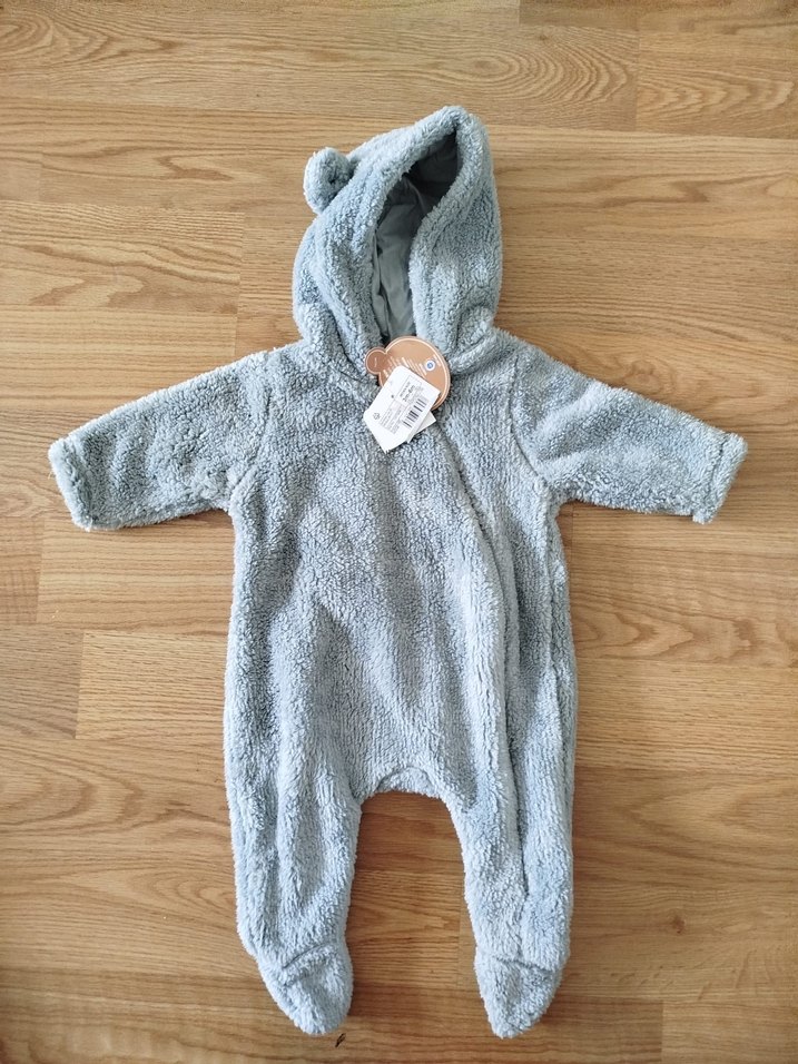 Yumuşak polar kumaştan yapılmış, kapüşonunda sevimli kulaklar bulunan gri örme erkek bebek tulumu. Desensiz sade ve rahat bir tasarıma sahiptir. Sıfır etiketli