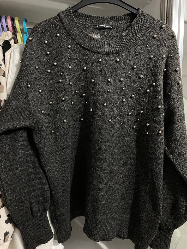 Gri renkli, uzun kollu, yuvarlak yaka, inci işlemeli triko kadın kazak. Rahat kesimi ve yumuşak dokusuyla günlük kullanıma uygundur.
