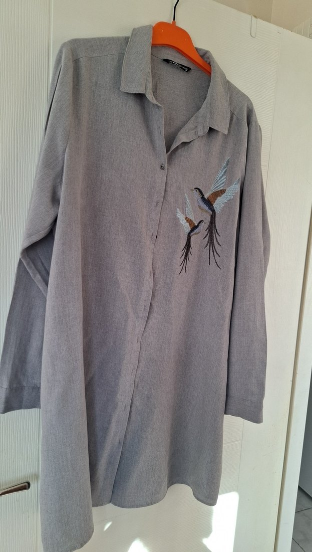 Gevşek kesim, uzun boy gri gömlek. Yakalı ve düğmeli, kuş nakışlı detaylarla günlük kullanıma uygun. ️