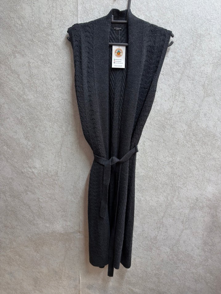 Gri renkte, uzun örme yün süveter. Kolsuz, yakası kesik ve bağlama kemeri bulunur. Rahat ve şık bir görünüm sunar.