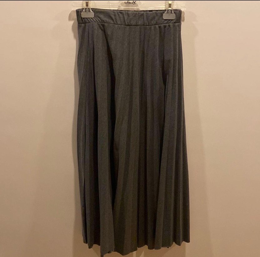 Gri renkte, uzun pilili ve bol kesim etek. Minimalist tasarımıyla ofis için uygundur.