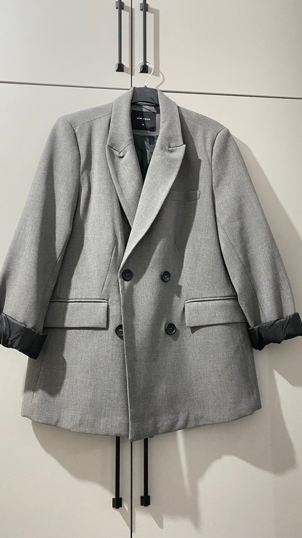 Gri renkte, düğmeli ve kesik yaka detaylı kadın blazer ceket. pamuklu kumaştan, normal kesim ve uzun kollu, ofis ve günlük kullanıma uygun. bir kez görseldeki gün giyildi.
