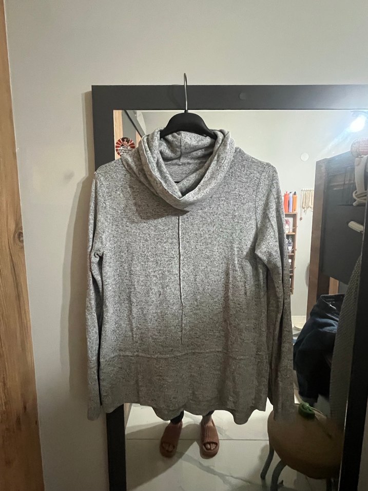70/44Gri renkte, yumuşak dokulu, yüksek yakalı ve uzun kollu kadın kazak. Rahat kesimi ve midi boyu ile günlük rahat sokak stili için uygundur.