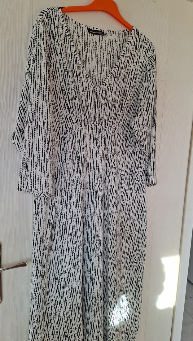 Uzun, zebra desenli Elbise. V yakalı, uzun kollu ve bol kesimdir. Günlük kullanım için yumuşak sentetik kumaştan yapılmıştır.