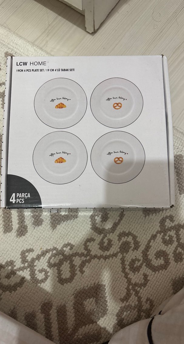 LCW HOME markasına ait, her biri 19 cm çapında, üzerinde sade yiyecek çizimleri ve yazılar bulunan 4 beyaz tabak seti. ️