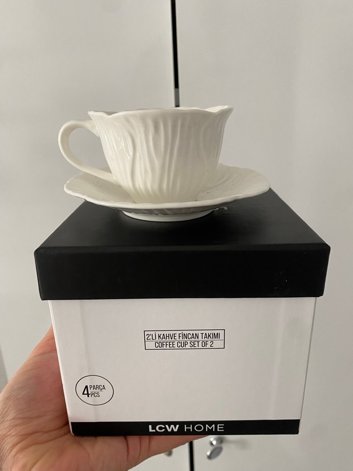 LCW Home markasına ait beyaz, dokulu 2'li kahve fincanı ve tabak seti. ☕