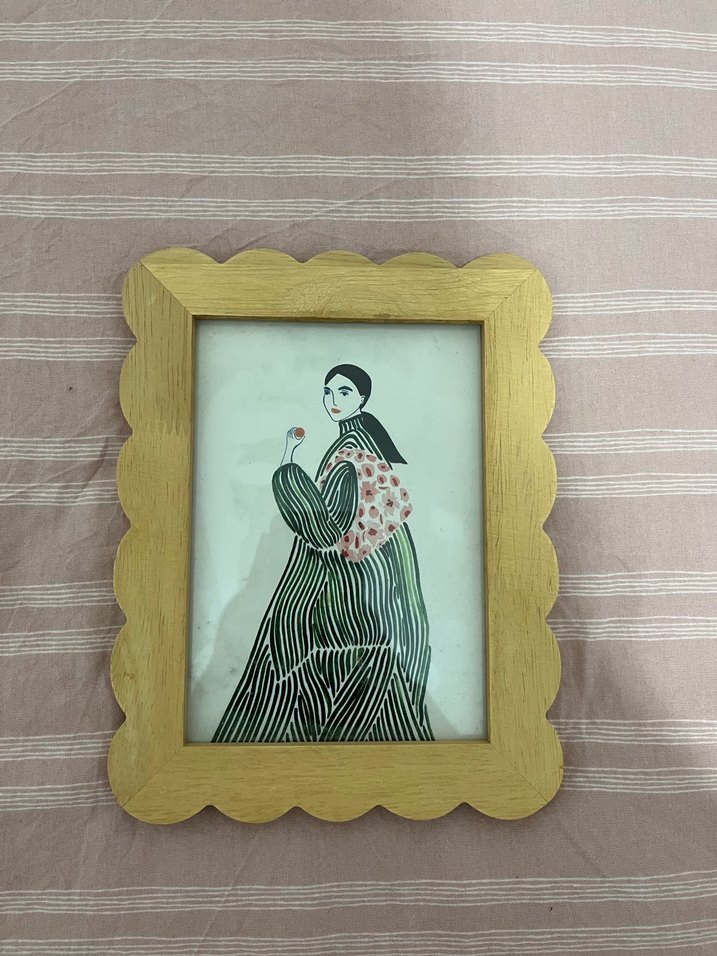 Dalgalı kenarlı, bej renkte bir fotoğraf çerçevesi. Pastel ve yumuşak bir görünüm sunar. Fotoğraflara zarif bir dokunuş katıyor sıfır ayarında