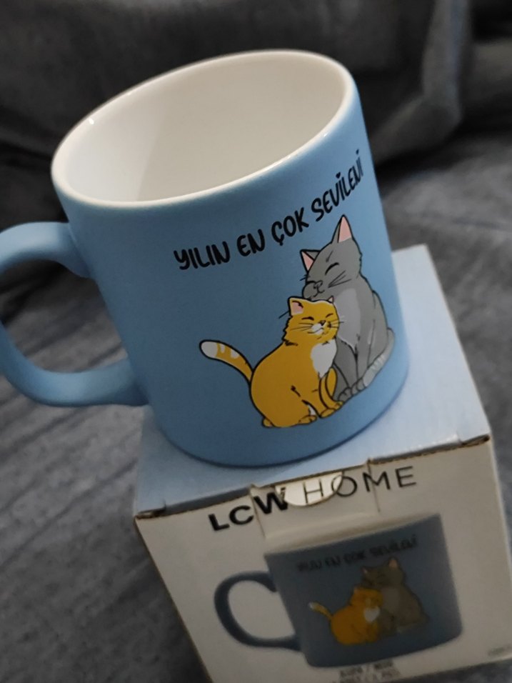 LCW Home markasına ait, üzerinde "Yılın En Çok Sevilen" yazısı ve sevimli kedi figürleri bulunan mavi seramik kupa .