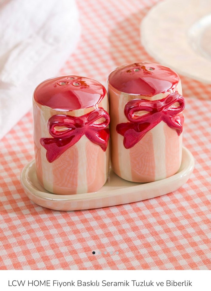 LCW HOME'un pastel pembe seramik tuzluk ve biberliği, fiyonk desenli ve tepsi ile birlikte sunulur.