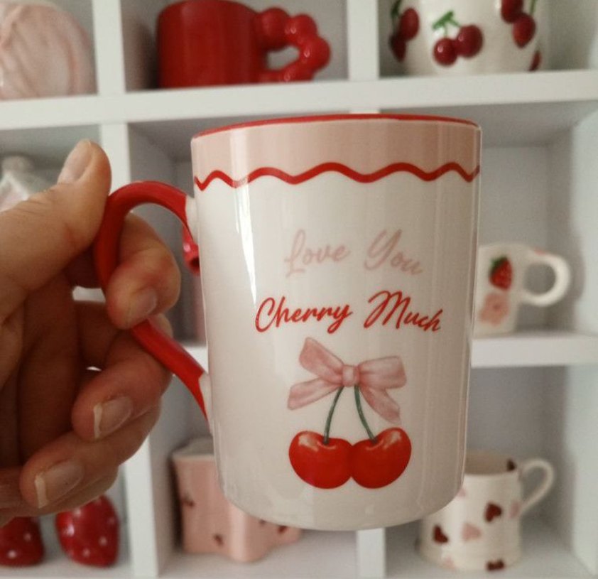 Pastel pembe renkte, kiraz desenli seramik kupa. "Cherry Much, Love You" yazısı ve kırmızı kulp ile süslenmiştir. Yeni, etiketlidir.