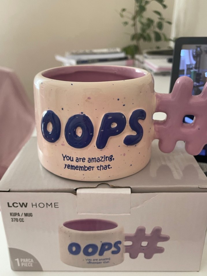 LCW HOME markalı pastel pembe renkte, 370cc hacminde, # şeklinde kulplu ve "OOPS You are amazing, remember that." yazılı kupa. Hiç kullanılmadı ☕️