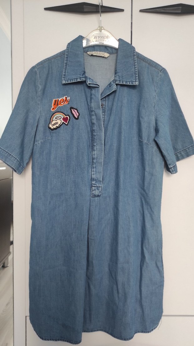 Yumuşak kot kumaştan, kısa kollu, düğmeli ve nakışlı, mavi gömlek elbisesi. Rahat kesimiyle günlük kullanıma uygundur. Ürün hiç kullanılmamıştır. Genç hanımların kreasyonu bir üründür. XXS bedendir. XS için de uygundur. Sağ göğüs kısmında eğlenceli detaylar bulunur. İki tarafında da cepleri vardır. Ölçüleri; boyu 79 cm, etek genişliği 52 cm, kol uzunluğu 25,5 cm'dir.