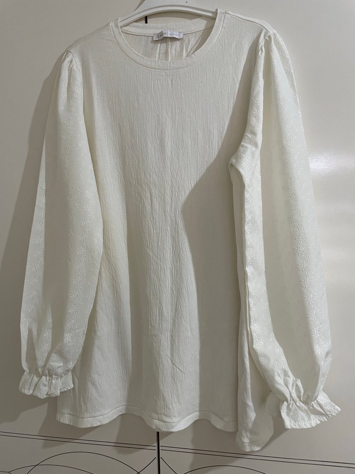 Kadın beyaz keten kumaştan, uzun kollu ve fırfırlı detaylı, yuvarlak yakalı, bol kesim bir bluz. Minimalist ve bohem tarzda, günlük kullanıma uygun.