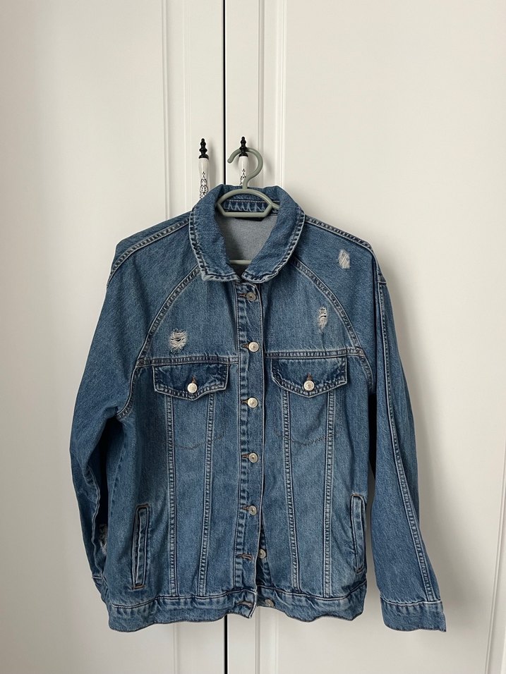 Uzun modeldir. Düğmeli, notched yakalı, midi uzunlukta mavi denim ceket. Salaş kesimi ve hafif yıpranmış detaylarıyla günlük sokak stili için uygundur.