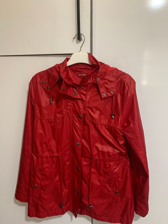 Kadın kırmızı yağmurluk, parlak görünümlü, düğmeli, kesik yaka detaylıdır. Uzun kollu, bol kesim ve midi boydadır, sentetik kumaştan üretilmiştir.sorunsuz iki koltuk arası ölçü 49-50 cm