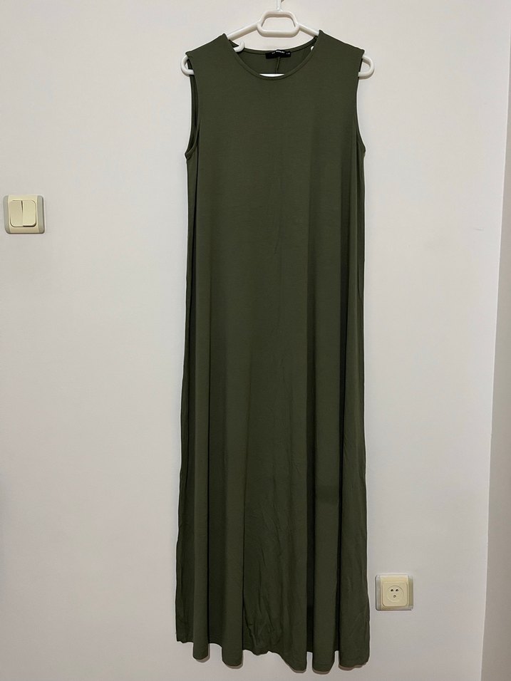 Koyu haki renginde, kolsuz ve bol kesimli, dökümlü uzun elbise. Yumuşak sentetik kumaştan, yuvarlak yakalı, sade ve minimalist tarzda, günlük kullanıma uygun. Yırtmacı yoktur.