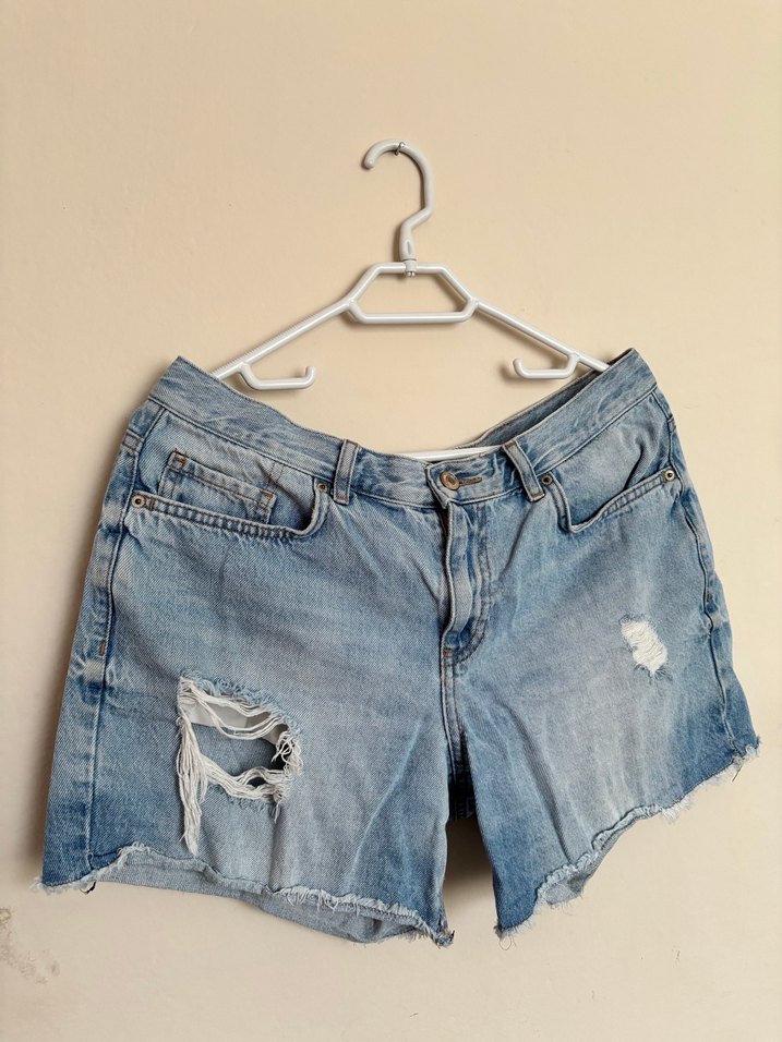 LCW 42 beden, rahat kesim, yırtık detaylı mini kot şort. Günlük stil için uygun.