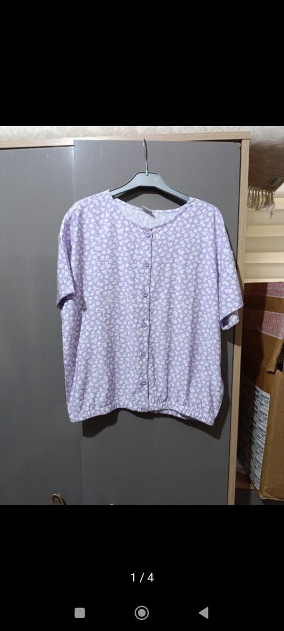 Mor renkli, pamuklu, kısa kollu, yuvarlak yakalı ve düğmeli rahat kesim tişört. Pastel tonlu desenli, günlük ve spor tarzda kullanıma uygundur.