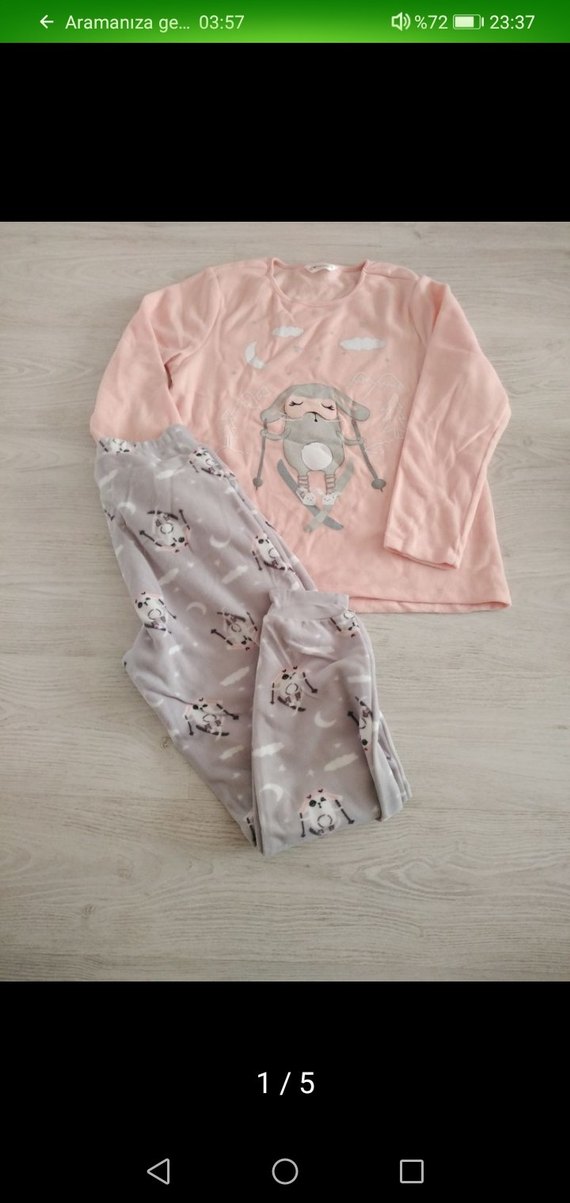 yumuşak ve sıcak polar kumaştan, gri baskılı pantolon ve bisiklet yaka, örme detaylı pastel pembe uzun kollu üstten oluşan pijama takımı.