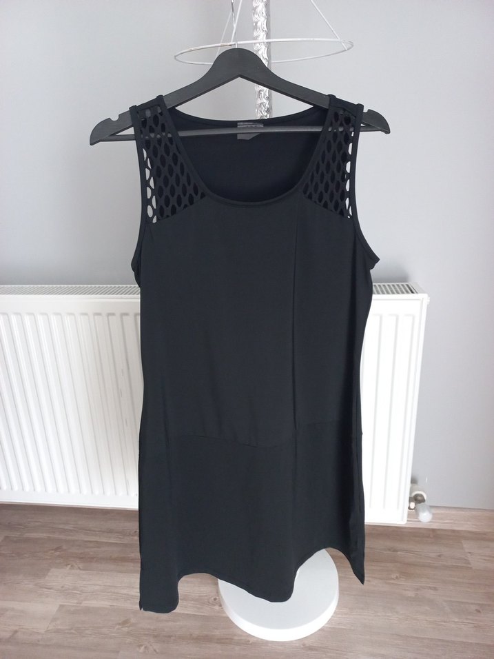 Kolsuz, siyah midi plaj elbise, fitted kesim ve yuvarlak yaka, omuzlarda file detaylarıyla sade ve şık.
