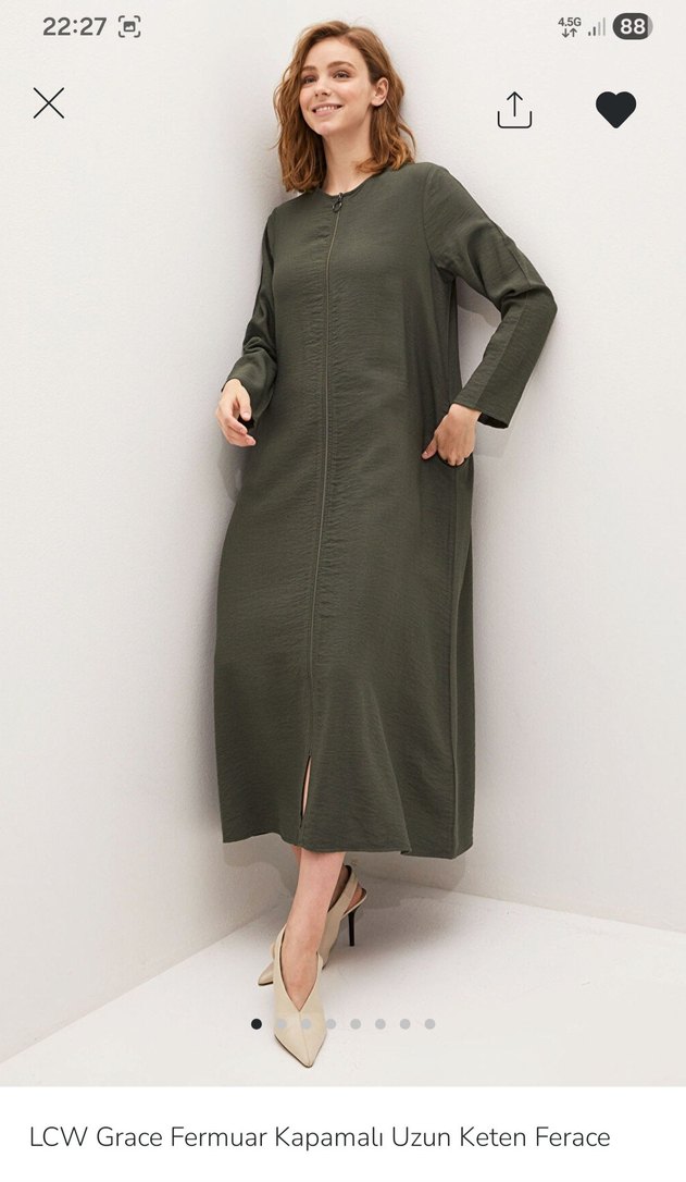 LCW kadın uzun keten ferace, V yaka, uzun kollu ve yırtmaçlıdır. Sentetik kumaştan, bol kesim ve haki renkte, günlük kullanım için uygundur.
