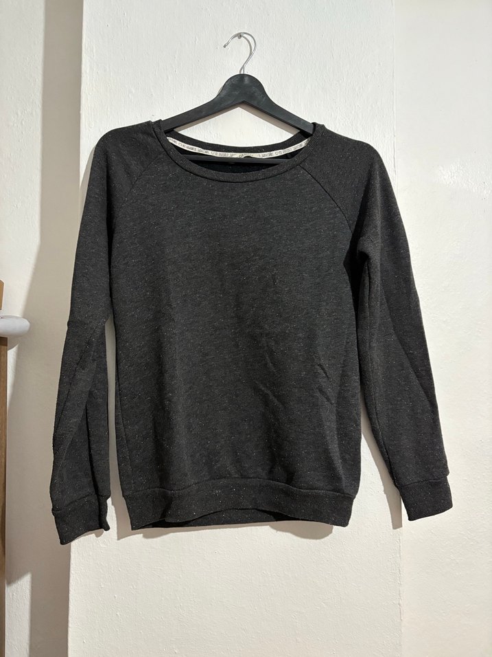 Gri / antrasit renkte, yuvarlak yakalı ve uzun kollu kadın sweatshirtü. Rahat kesimi ve yumuşak keten kumaşıyla günlük kullanım için şık ve rahat bir seçenek.