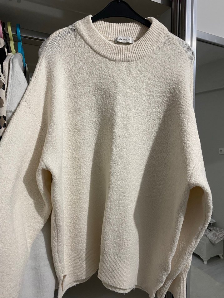 Beyaz yumoş kazak, yuvarlak yaka ve uzun kollu, boyu kalçayı kapatır. M beden ama 42-44 bile giyebilir
