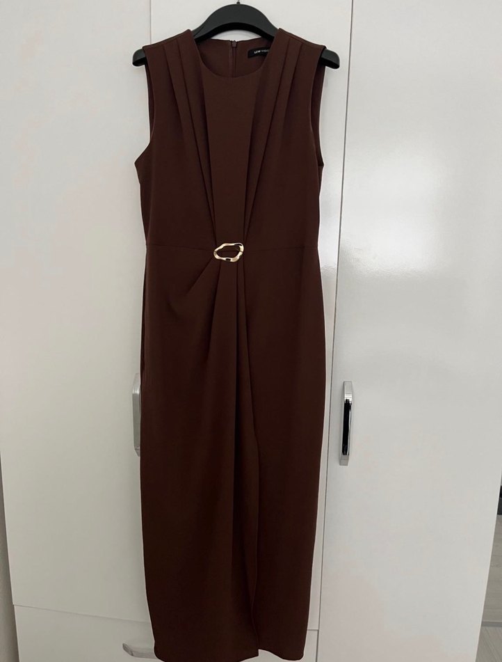 Kahverengi, kolsuz, V yaka ve kemerli uzun elbise. İpek gibi kumaştan, rahat kesim ve minimalist modern klasik tarzda, ofis için uygun. 2 kere giyildi. Koltuk altı eni: 47 Boy:136