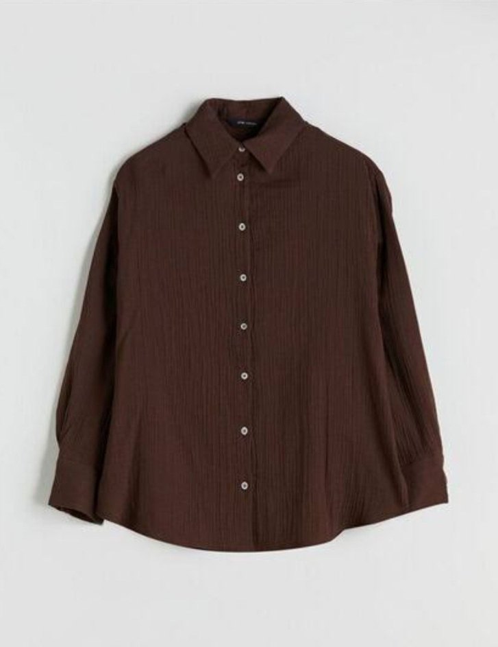 Düğmeli, uzun kollu kahverengi keten gömlek. Yaka ve bol kesim, desen içermeyen minimalist tasarım. Ofis kullanımı için uygundur. 2xl fakat dar kalıp oluo xl-l uyumluda olabilmektedir.