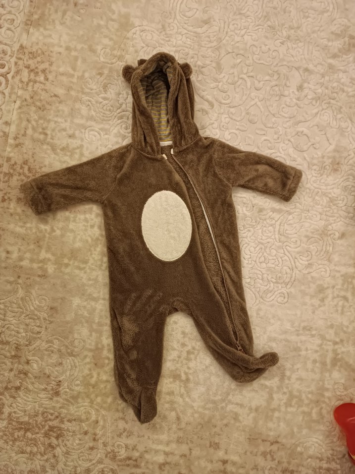 Kahverengi, yumuşak ve sıcak kumaşlı bebek tulumu. Kapüşonunda kulaklar ve önde fermuar bulunur, sokak giyimi için uygundur. etiketi kesmiştim ölçüleri ekeldim, ölçülere göre alım yapınız, 9-12 da giydirdim, 9-12 ay olması lazım