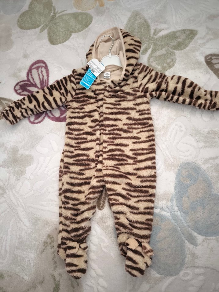 Kahverengi zebra desenli, kapüşonlu ve tüy detaylı, yumuşak ve sıcak kumaştan yapılmış bebek tulumu. Ayakları kapalıdır. Alt kısmı çıtçıtlidir. Etiketlidir