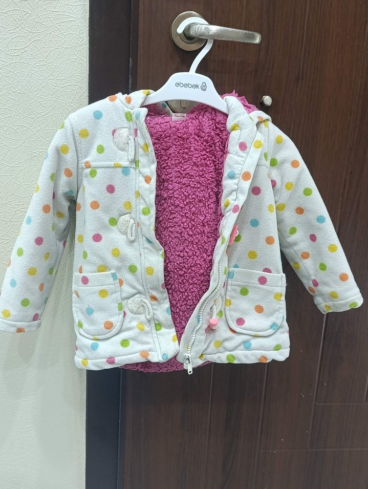 Kapüşonlu, düğmeli ve renkli nokta desenli bu kız çocuk montu, rahat ve sıcak dokusuyla sokak stiline uygundur. iş astarinda kapson kismindagorseldeki gibi basiklikevcut harici leke sökük delik vs yoktur çok iyi durumda çok sıcak tutan monttur