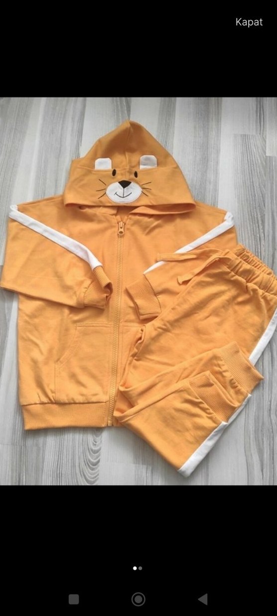 Kapüşonlu, fermuarlı, hayvan yüzü baskılı uzun kollu üst ve beyaz şerit detaylı pastel sarı yumuşak kumaştan bebek takımı. 3_4 yaş