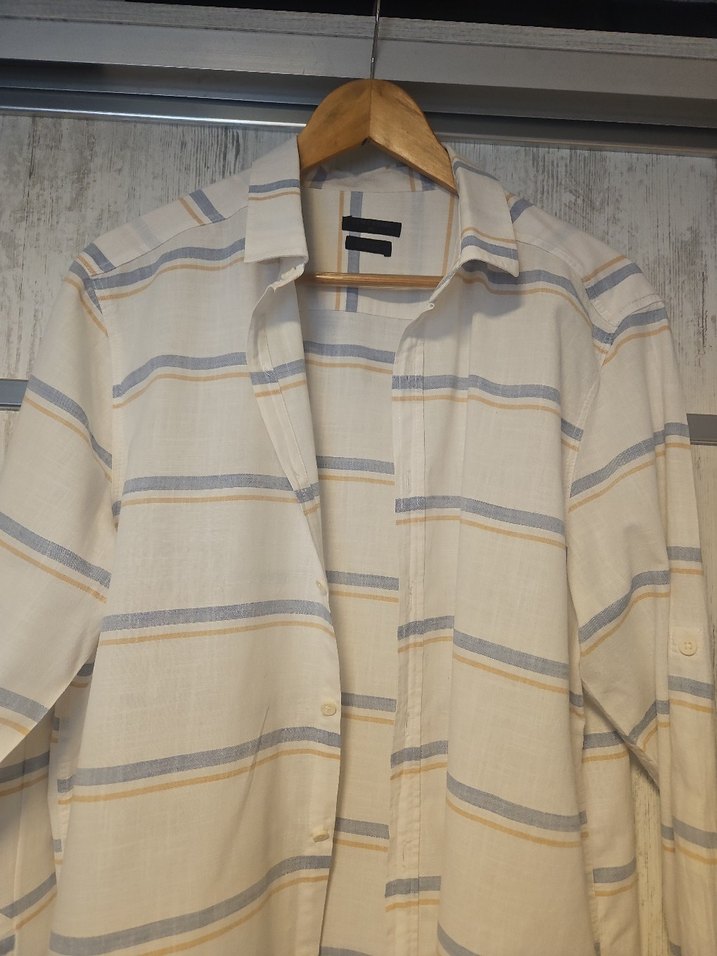 LCW keten erkek gömlek. Normal 80 cm uzunlukta, genişlik 62 cm.. Beyaz çizgili, günlük rahat sokak stili için uygundur.